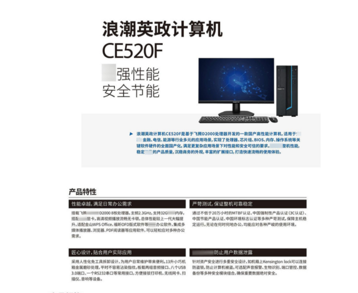 INSPUR浪潮 CE520F 1顆飛騰D2000處理器 硬盤獨(dú)立顯卡 8GB內(nèi)存256GB SATA SSD硬盤鍵鼠