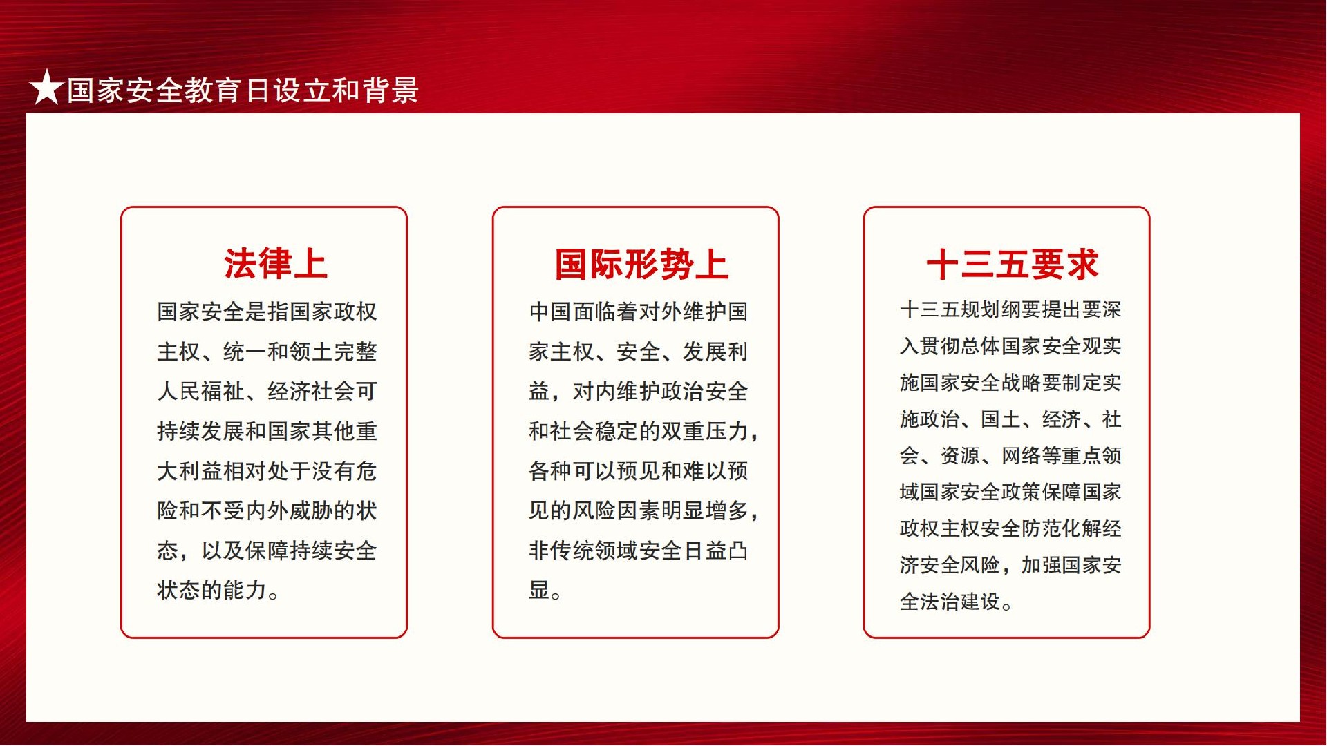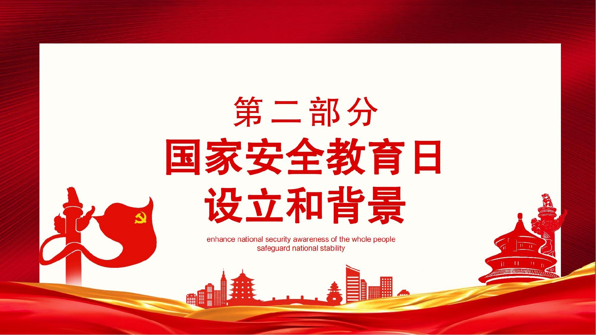 值此第九個(gè)全民國家安全教育日來臨之際,作為中國公民,我們更應(yīng)積極加強(qiáng)國家安全教育,國家安全由你我共筑。使關(guān)心國家安全、維護(hù)國家安全成為思想共識和行動(dòng)自覺。