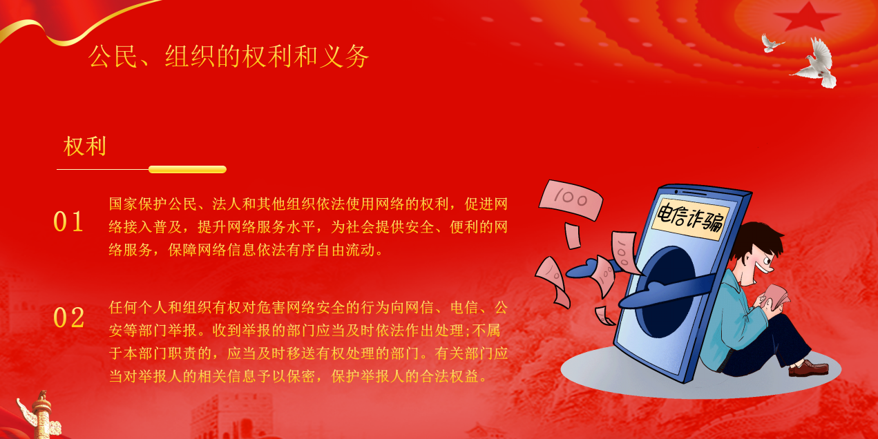 在網(wǎng)絡(luò)安全保障體系中,公民與組織依法享有的權(quán)利可分為"積極權(quán)利"與"消極權(quán)利"兩大維度,這兩類權(quán)利共同構(gòu)筑了網(wǎng)絡(luò)空間的權(quán)益保護(hù)網(wǎng)。網(wǎng)絡(luò)安全不是某一個人的事,而是我們每個人都要守護(hù)的共同責(zé)任。作為公民和組織,在網(wǎng)絡(luò)空間里該怎么做、不該怎么做,其實有著清晰的“行為指南”。我們可以把這些責(zé)任分成三個層面來記:首先是必須守住的“底線義務(wù)”,其次是絕對不能碰的“禁止行為”,最后是千萬別忽視的“協(xié)助責(zé)任”。
