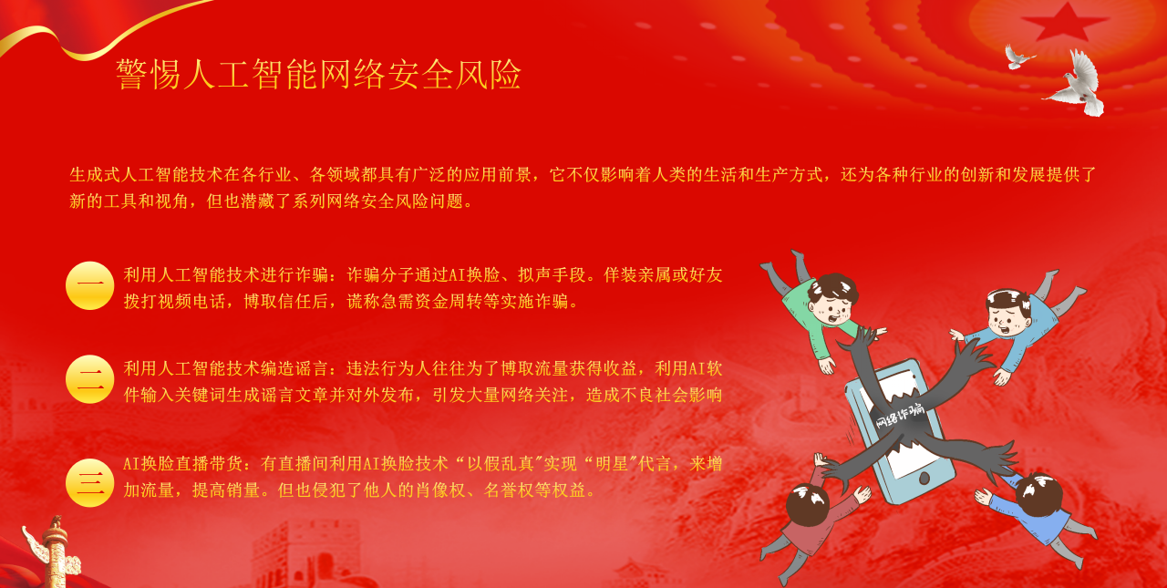 人工智能在為生活帶來便利的同時,也催生了新型網(wǎng)絡(luò)安全風(fēng)險。這些風(fēng)險不僅威脅個人財產(chǎn)安全,還可能擾亂社會秩序、侵犯知識產(chǎn)權(quán),需要我們高度警惕。網(wǎng)絡(luò)安全不是某一個人的事,而是我們每個人的事。 當(dāng)我們看到電信詐騙案中的受害者痛哭流涕,當(dāng)企業(yè)數(shù)據(jù)泄露導(dǎo)致千萬用戶權(quán)益受損,當(dāng)關(guān)鍵信息基礎(chǔ)設(shè)施面臨潛在威脅,我們更能理解:個人的疏忽可能成為整個網(wǎng)絡(luò)的薄弱環(huán)節(jié),而每個人的警惕則能匯聚成堅不可摧的安全力量。唯有全社會共同努力,才能筑牢這道無形的“防火墻”,織密覆蓋全民的“保護(hù)網(wǎng)”。